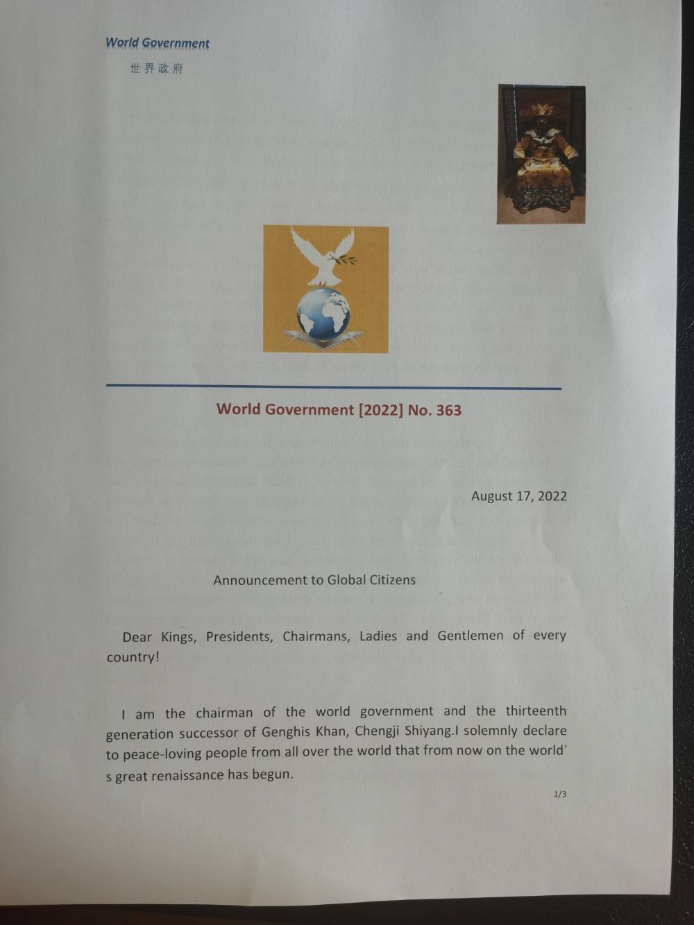 I am the chairman of the world government and the thirteenth generation successor of Genghis Khan, Chengji Shiyang.I solemnly declare to peace-loving people from all over the world that from now on the world’s great renaissance has begun.